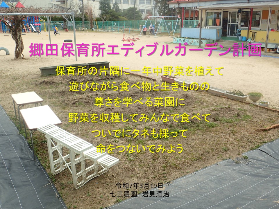昨年から市立の郷田保育所さんに有機栽培米を卸させていただいてましたが、今年は依頼を受けて「エディブルガーデン計画」を作らせていただきました。