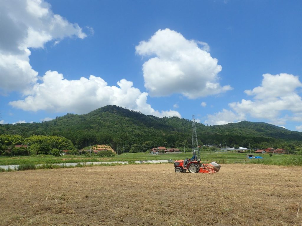トラクターでの耕耘は、暑すぎて他の作業が出来ない12時から16時の間に行うのでかなりシンドイですが、草ボウボウでイノシシの巣になっていた休耕地が整備されるので、地主さんも喜び、地域としても喜ばれると思います。
