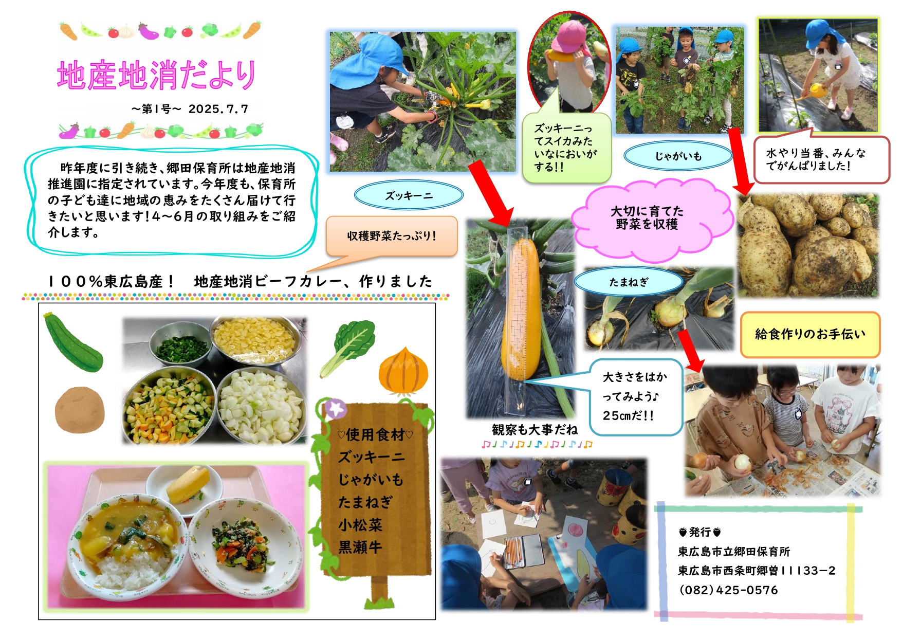 園児と先生が育てたズッキーニ、じゃがいも、玉ねぎ、市内産の小松菜や黒瀬牛を使って地産地消カレーを作ったそうです。
