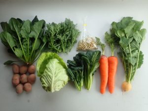 肝心の野菜ですが、にんじん、じゃがいも、里芋などのベース野菜に、ハウスの春菊、カブ、小松菜、抑制カボチャ、乾燥大豆などが加わり、なんとか2月いっぱいはお届け出来そうです。